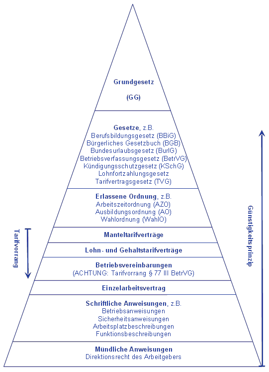 Das Arbeitsrecht ist in der Bundesrepublik Deutschland nicht durch ein eigenes Arbeitsgesetzbuch, sondern durch eine Vielzahl von Gesetzen, Rechtsvorschriften und Verordnungen geregelt. Da ein höherstehendes Recht nicht durch ein folgendes Recht gebrochen werden darf, wurde eine Rechtsnormpyramide geschaffen, welche die Rangfolge der einzelnen Rechte festlegt.